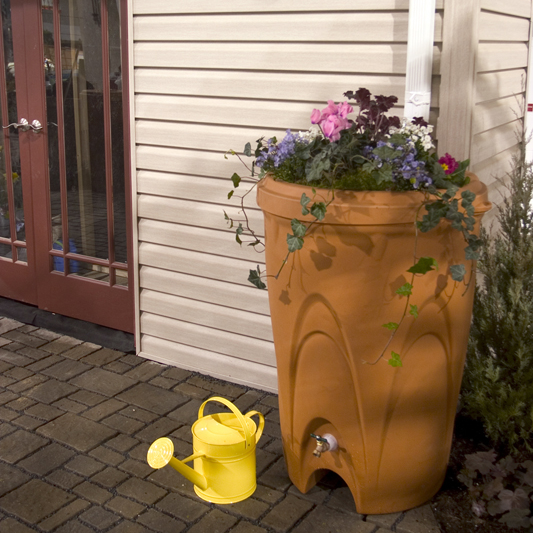Rain Barrel Type: Commercially Manafactured Size: 50 gal Color: Orange, Brown Rain Barrel Material: Plastic Estimated Cost: N/A Rain Water Primary Use: Gardening Overflow Frequency: Once a Year Rain Barrel Cover: Open Obtained From: Home Depot Installation Type: Self-Installed